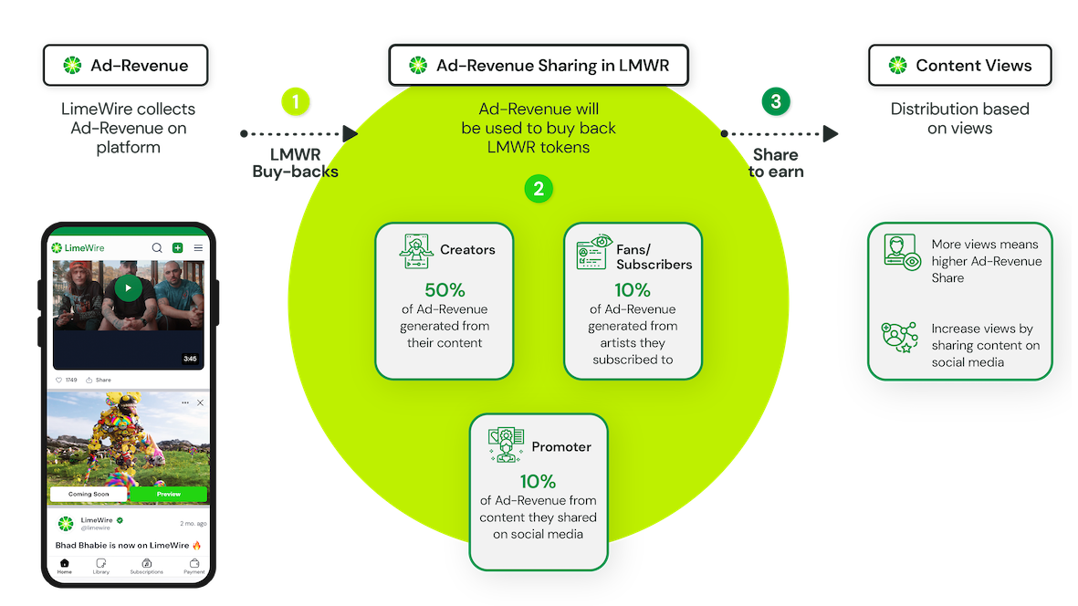 To optimize their Ad-Revenue Share, creators, subscribers and promoters are equally incentivized to boost content exposure for artists within and beyond the LimeWire ecosystem, making the LimeWire Ad-Revenue Sharing program a catalyst of growth for our community, and all $LMWR token holders.